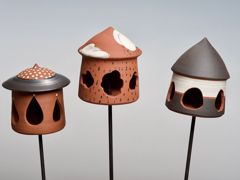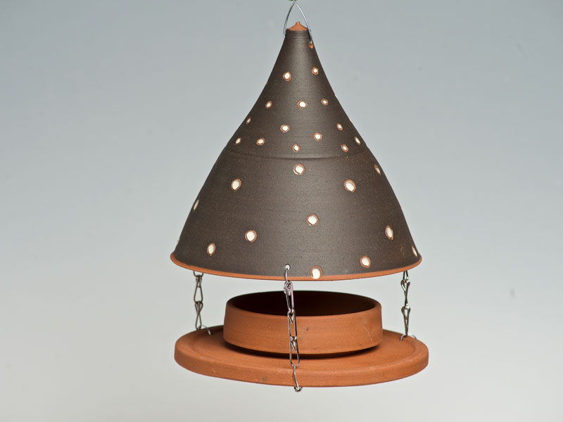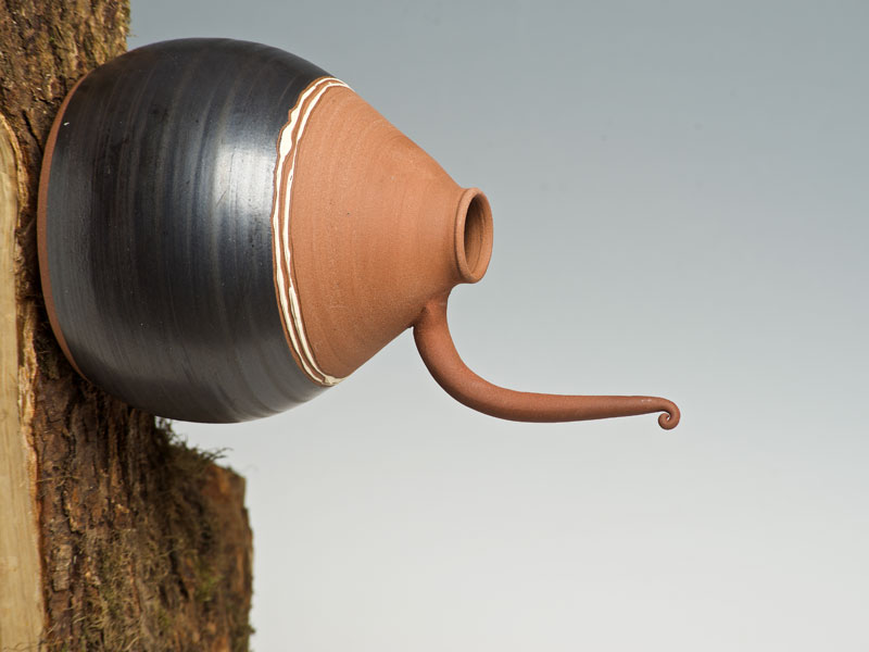 Nichoirs, mangeoires, abreuvoirs pour les oiseaux, supensions de plantes, arrosoirs Chantepleures, déco-tuteurs,... pièces en grès non gélif aux décors aux engobes naturels