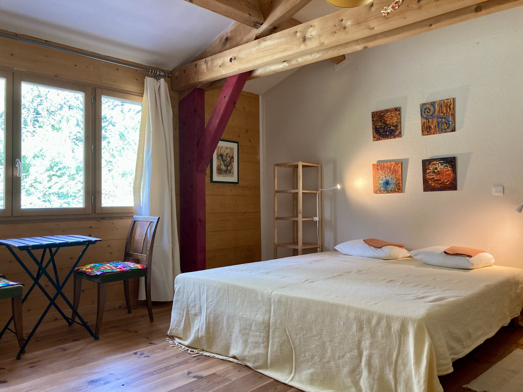 Je vous propose un hébergement le temps du stage : trois chambres confortables (de 16 à 22 m2) pour 1 personne, ou 2 personnes qui viennnent ensemble, une petite cuisine attenante à l'atelier et la salle d'eau dans le couloir des chambres.